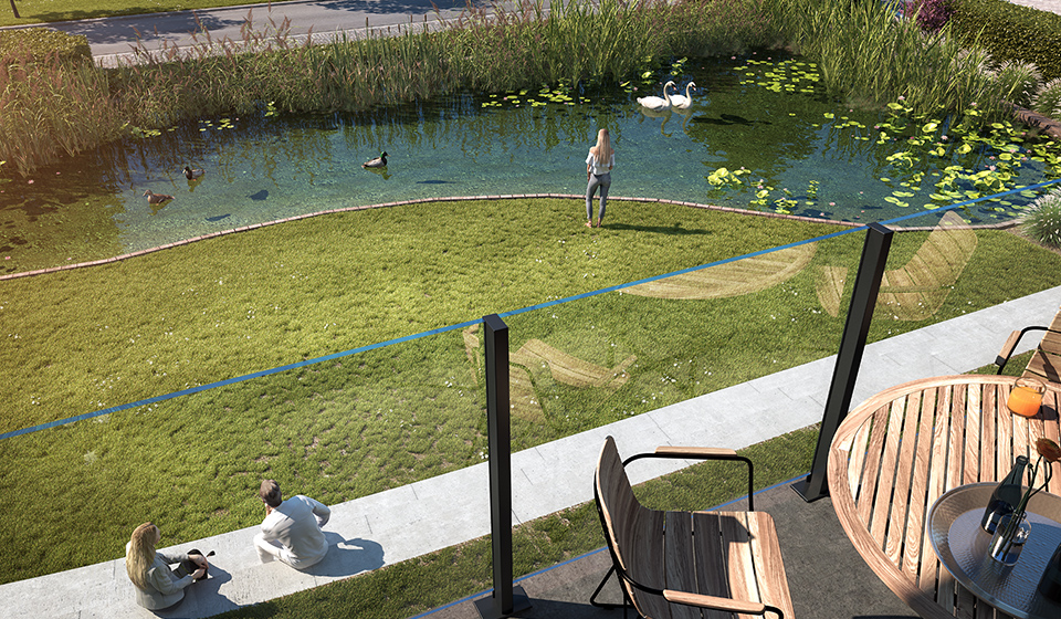 Groen en gezondheidsaspect : de buitenruimte wordt opgenomen in het aanpalende park met een prachtige lak en tal van groenvoorzieningen als een rustoase voor de bewoners.